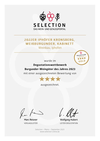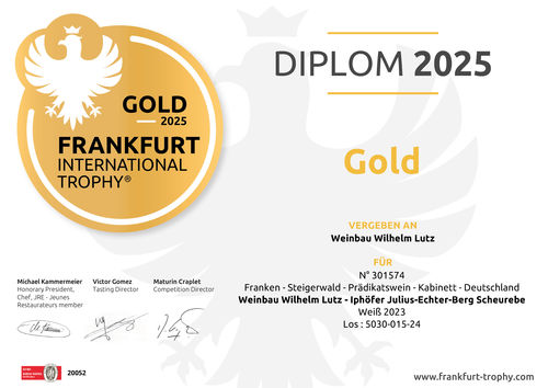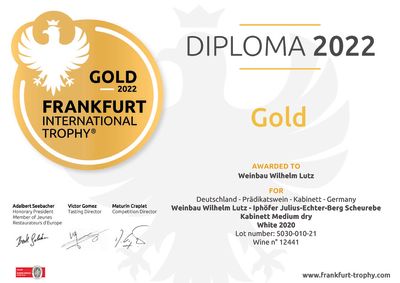 Wir freuen uns über die aktuelle Auszeichnung - aus 2.064 Weine prämiert: Frankfurt International Trophy 2020 in GOLD für unseren Weißburgunder Spätlese! Die Jury aus Sommeliers, Önologen, Weinhändler, Journalisten und andere Experten konnten dabei Weine aus über 50 Ländern verkosten. So freut es uns besonders, dass unser Wein mit GOLD bewertet wurde. |